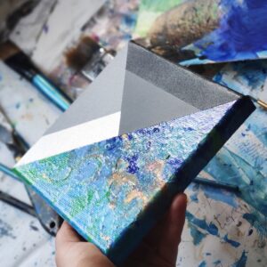 Konstrukcja moich obrazów opiera się na matematycznym podziale płaszczyzny i modułowym podejściu, co nadaje im unikalną strukturę i głębię. W swoich pracach eksploruję temat samotności w systemie rzeczywistego świata, próbując jednocześnie polemizować z jego zasadami. Sterylne, precyzyjnie skrojone płaszczyzny podkreślają te poszukiwania, dodając moim dziełom intelektualnego wymiaru.